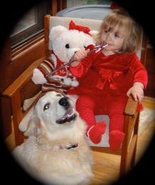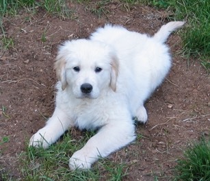 "Rufus"- {2.14.06} Misty & Penny's Dad; no health problems; boxy head; lineage from Canadian / English Cream; bred for mellow temperament and personality; musculature; long but fairly flat english cream coat; about 80 pounds He has a fairly lengthy proven great history of pups, having sired over 14 previous litters. Most of the children that come to adopt a pup end up wanting to take him home instead of a pup!