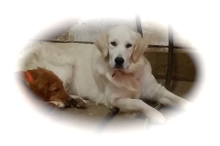 Snowflake has been a great golden as part of our family. She is very healthy and had her last litter on New Years Day, 2022 … at midnight, power out, 3 feet of snow! She and her pups did great, but she said, “I’m ready for some R & R!. She will be ready for a visit most any time. We recommend you peruse her litter page to see a video or two of her “in action” as well on on the parents page. She is mellow, but with plenty of “ball chasing” energy, and loves to romp around the lawn like a little kid. She is very keen to birds / ducks / chickens, though has never hunted them. She is a bit more “stocky” than our other English Cream goldens, coming from European Lineage of english cream goldens. She came to us from a breeder of english creams in Alabama and she has a beautiful wavy coat; somewhat fluffy, but a flatter english cream coat. She is content relaxing most of the day, barking rarely except if she wants to remind you to play with her, somewhat rarely and toward early evening. She loves to swim, though also content just watching swimmers. She loves to roll on her back, chase a ball, but sometimes doesn’t want to bring it back! She is content by herself, with our children, or with other goldens